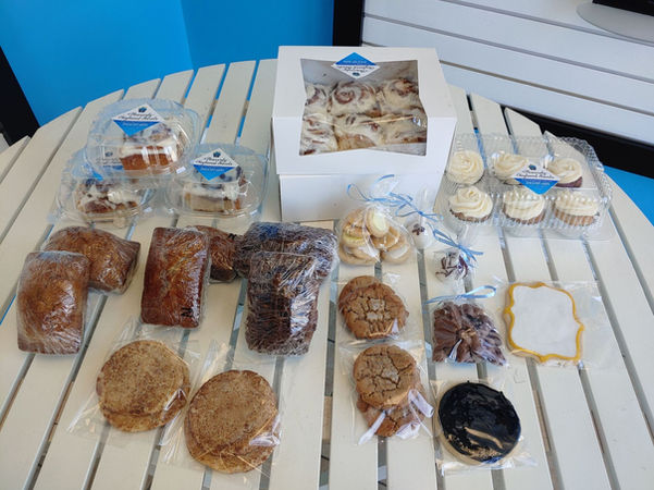 Weekly, we will have various croissants, scones, breads (Date nut, Banana, Lemon Blueberry, etc.), flourless chocolate cake, cobblers, pies, tarts. Other items that may be offered are cinnamon rolls, cookies, small cakes, shortbread, buttermilk biscuits, crepes, and some sugar free items.
